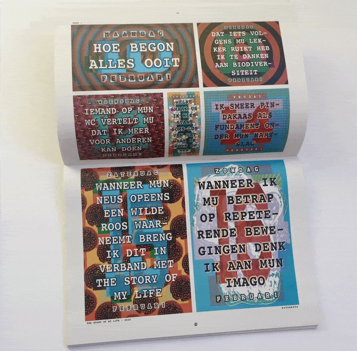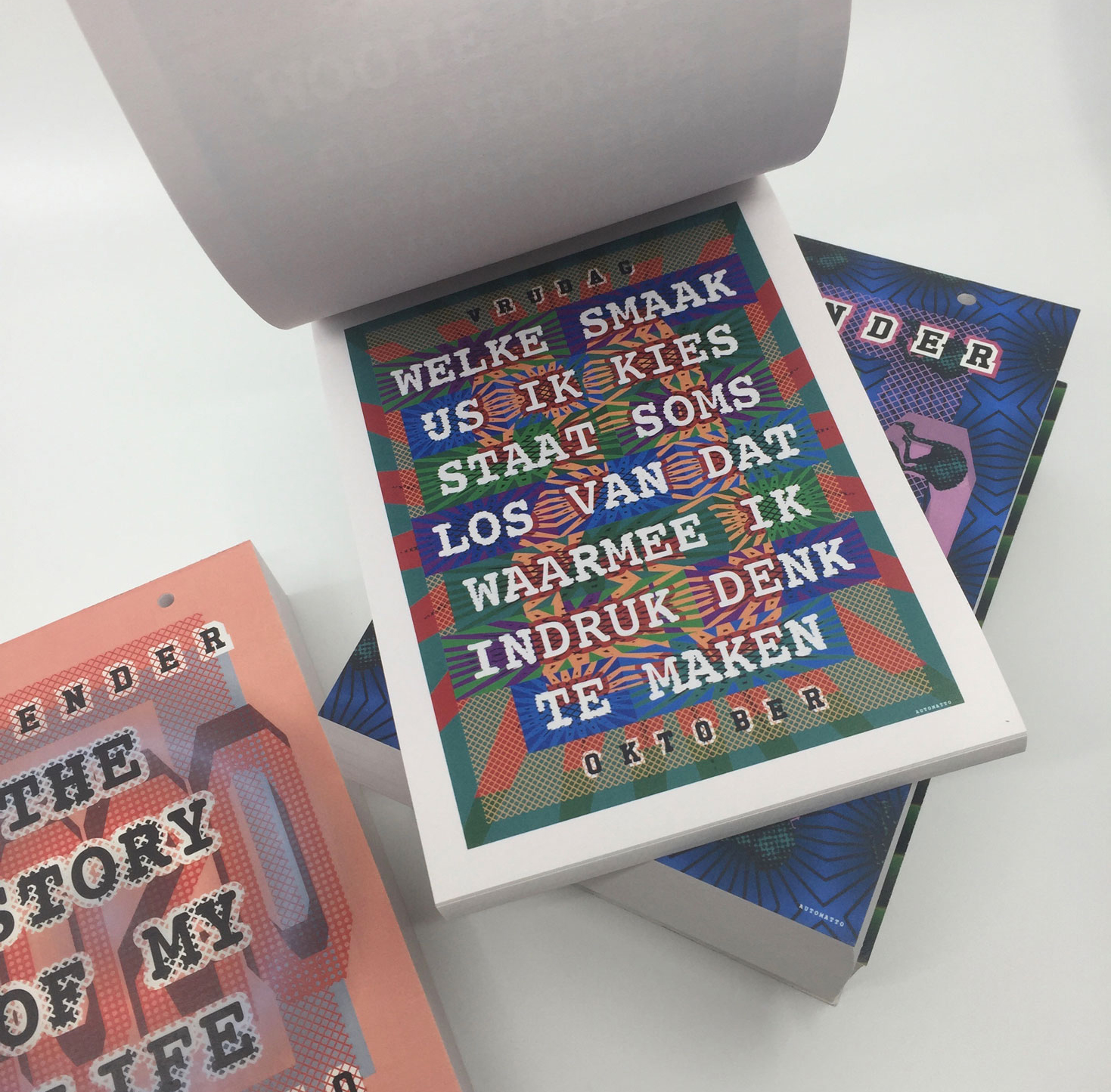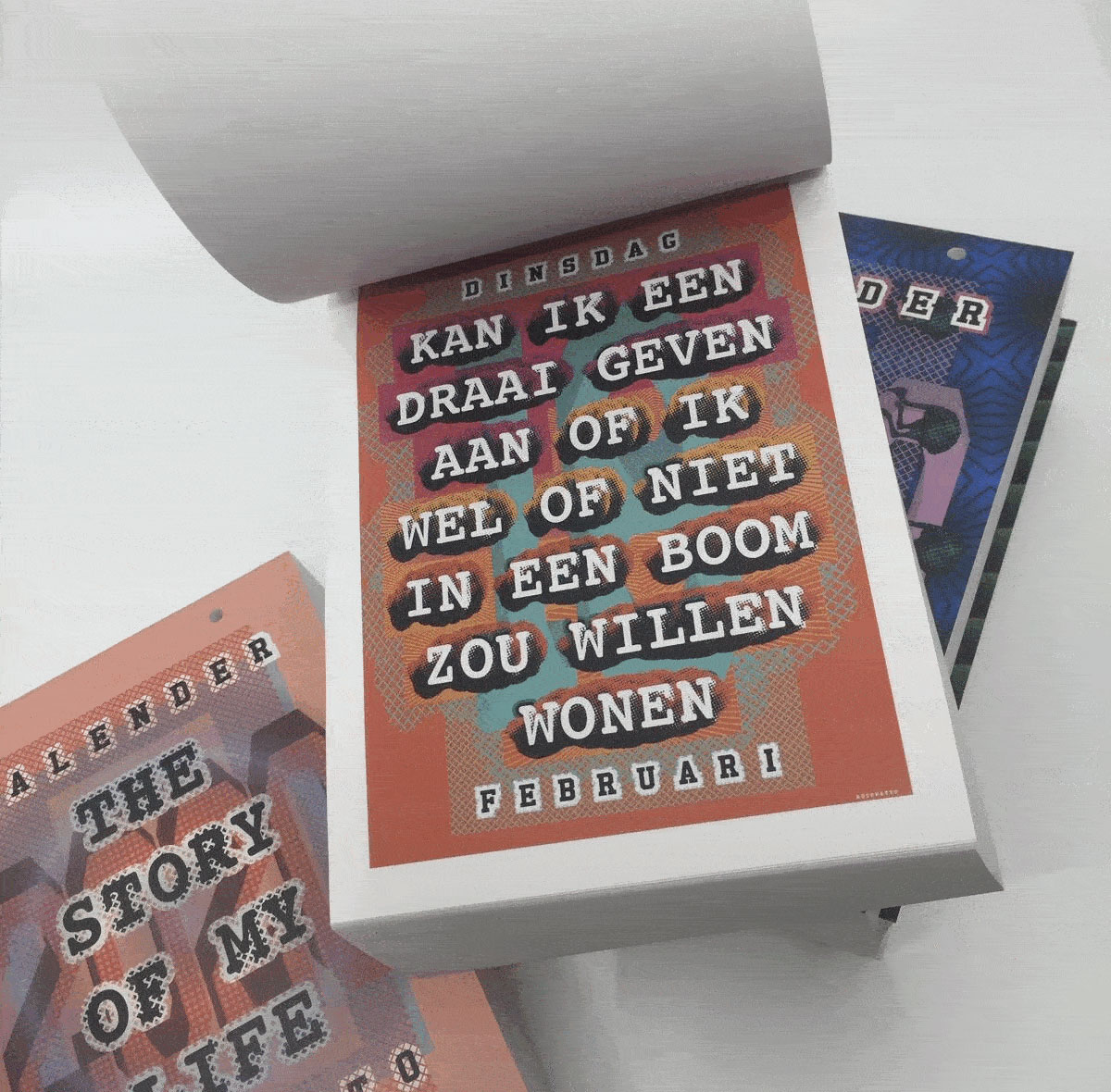 1. Hier als scheurkalender2. Elk exemplaar heeft een ander omslag3. Elke dag heeft een andere tekst en patroon (1)4. Elke dag heeft een andere tekst en patroon (2)5. Voorbeeld van een weekkalender