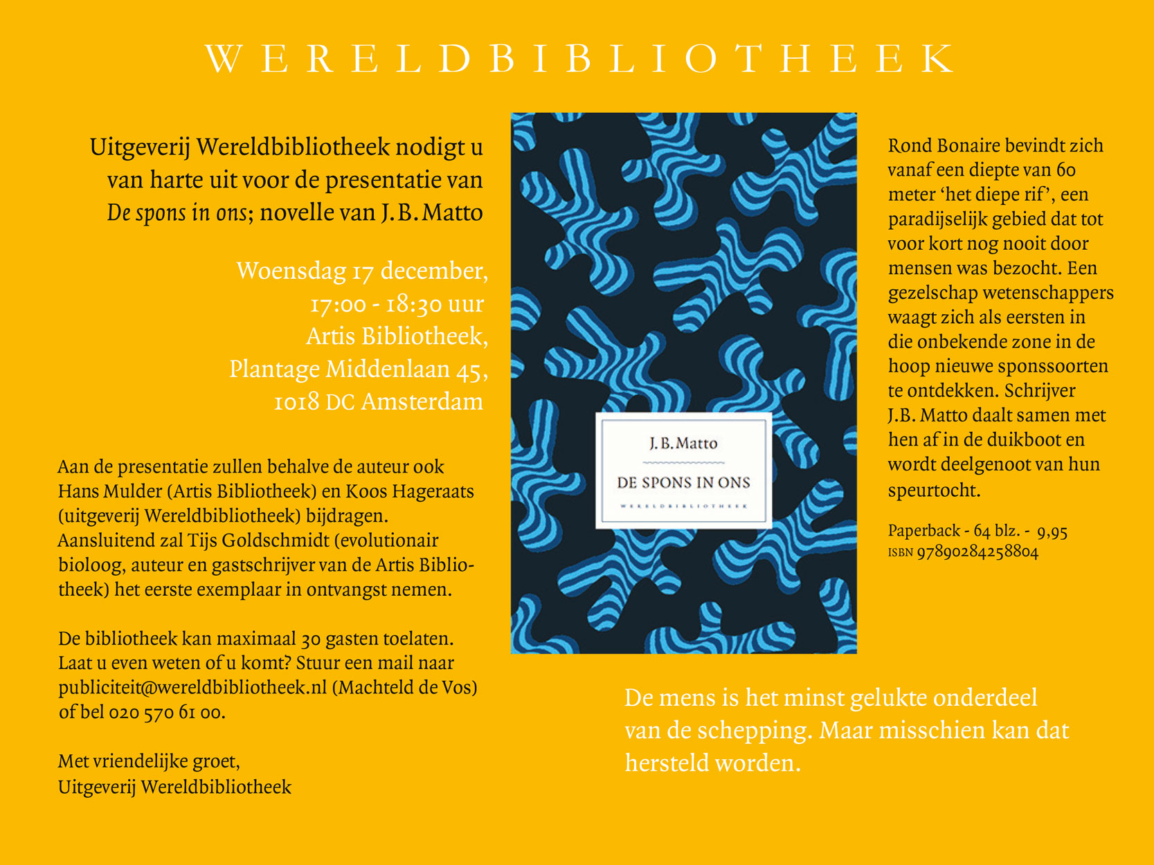 Introductie van uitgever Koen van GullikIntroductie van uitgever Koen van GullikCommentaar van Tijs GoldschmidtPraatje van JBAan Artis geschonken exemplaar meet zich aan voorgangersUitnodiging van de uitgeverij